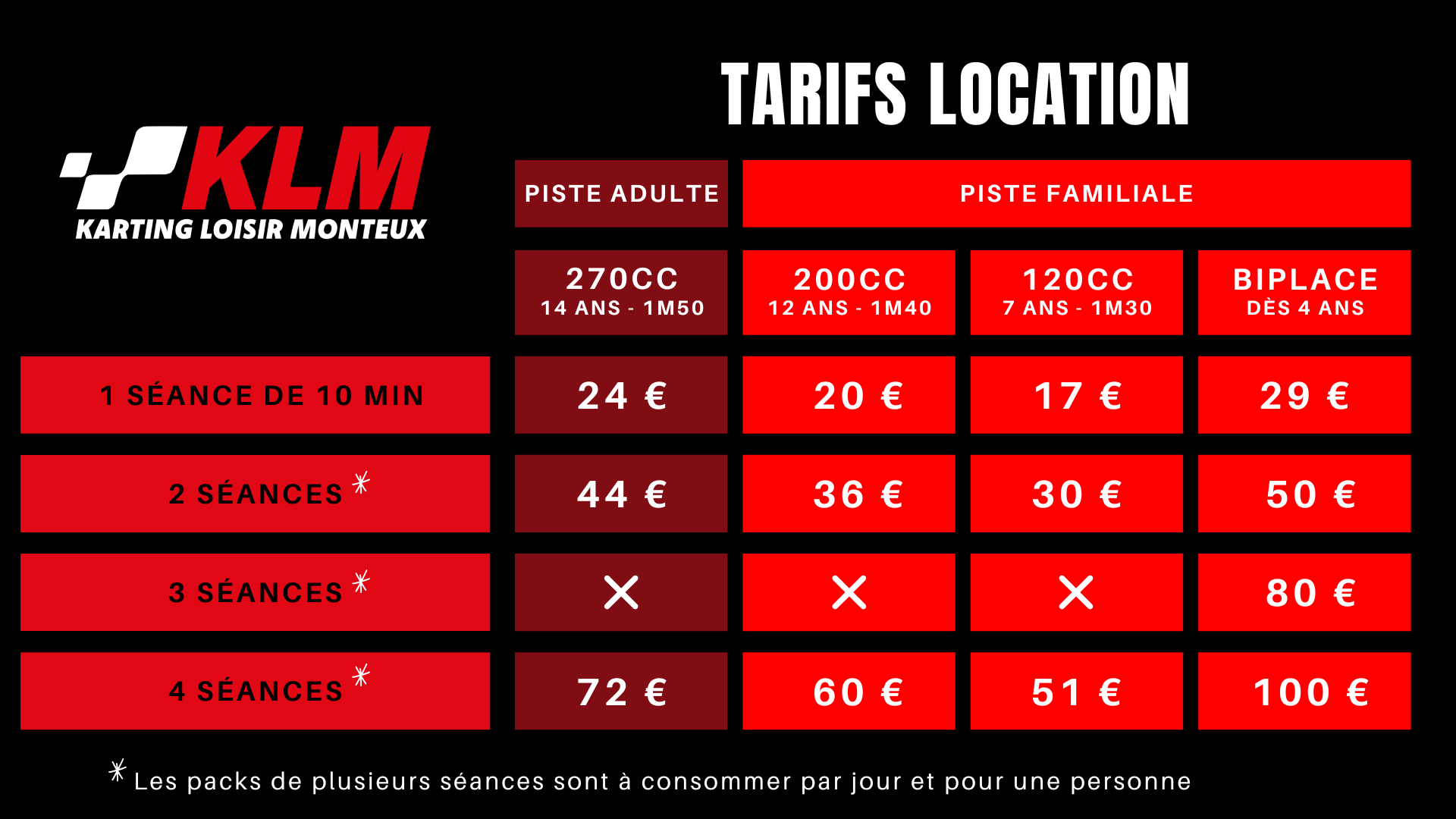 Les karts 120cc, 200cc et biplace roulent ensemble dans les mêmes séances et ne sont JAMAIS mélangés avec les 270cc.