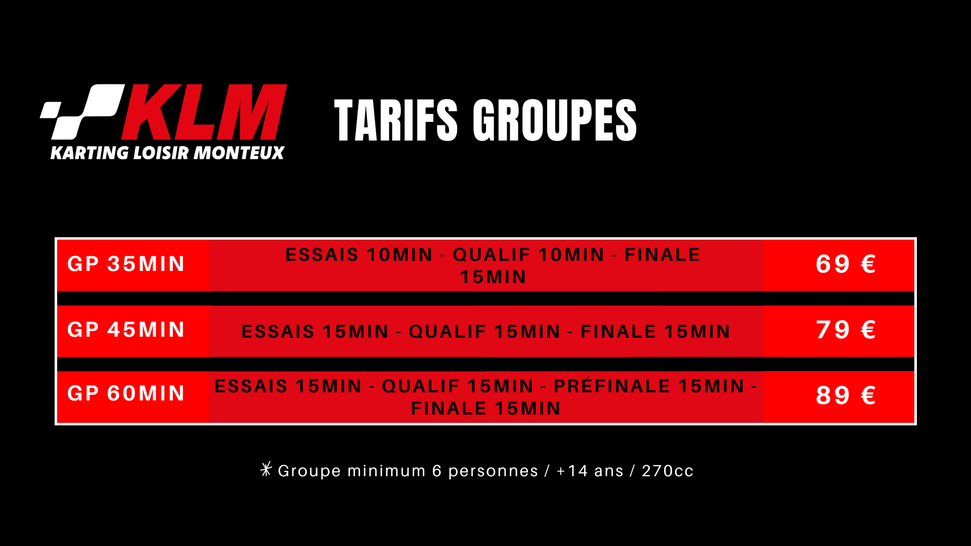 à partir de 6 persones et +14ans formules proposées pour les groupes L’équipe KLM vous propose des formules GP regroupant essais, qualification et course avec un départ arrêté en piste réserver ici