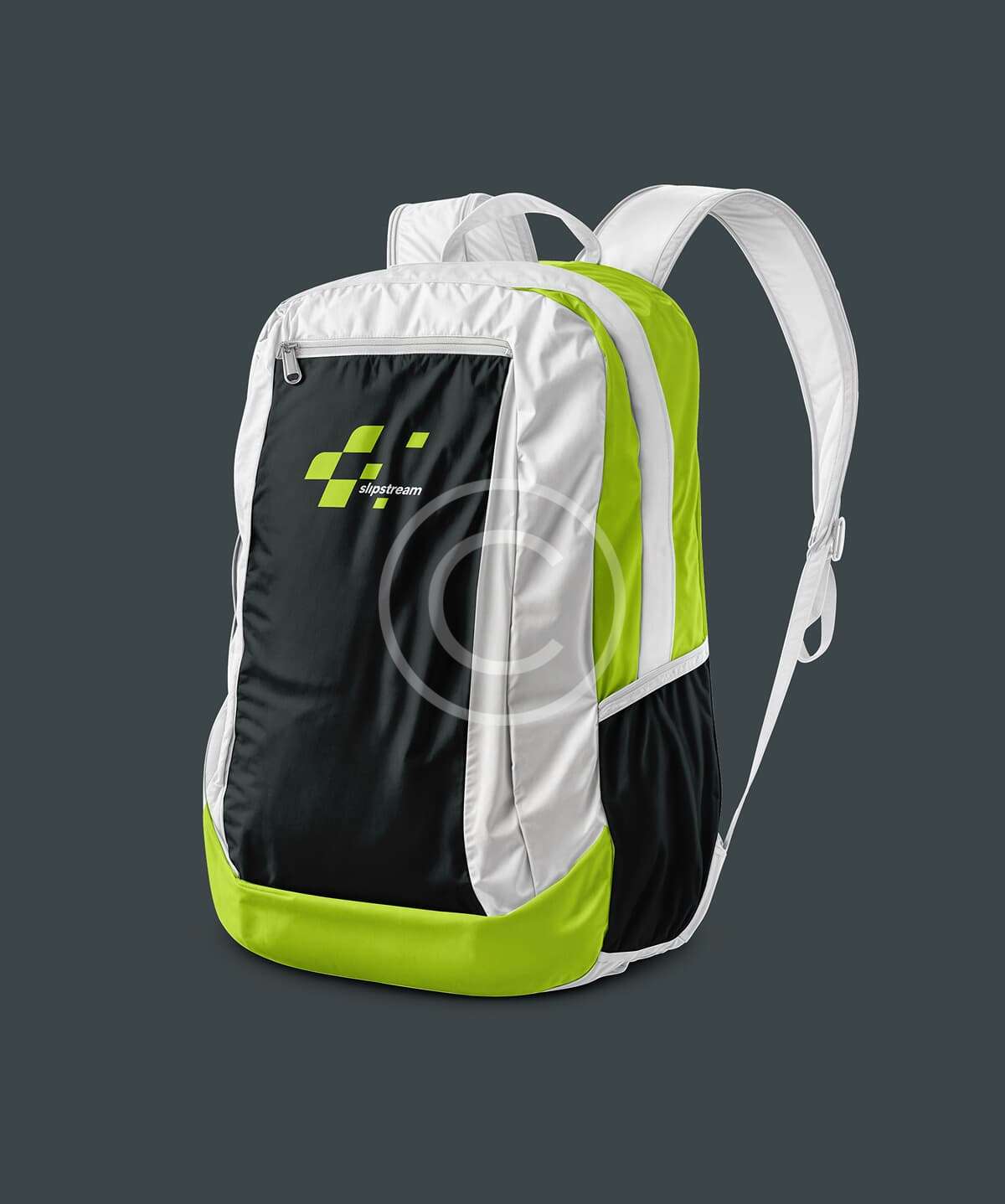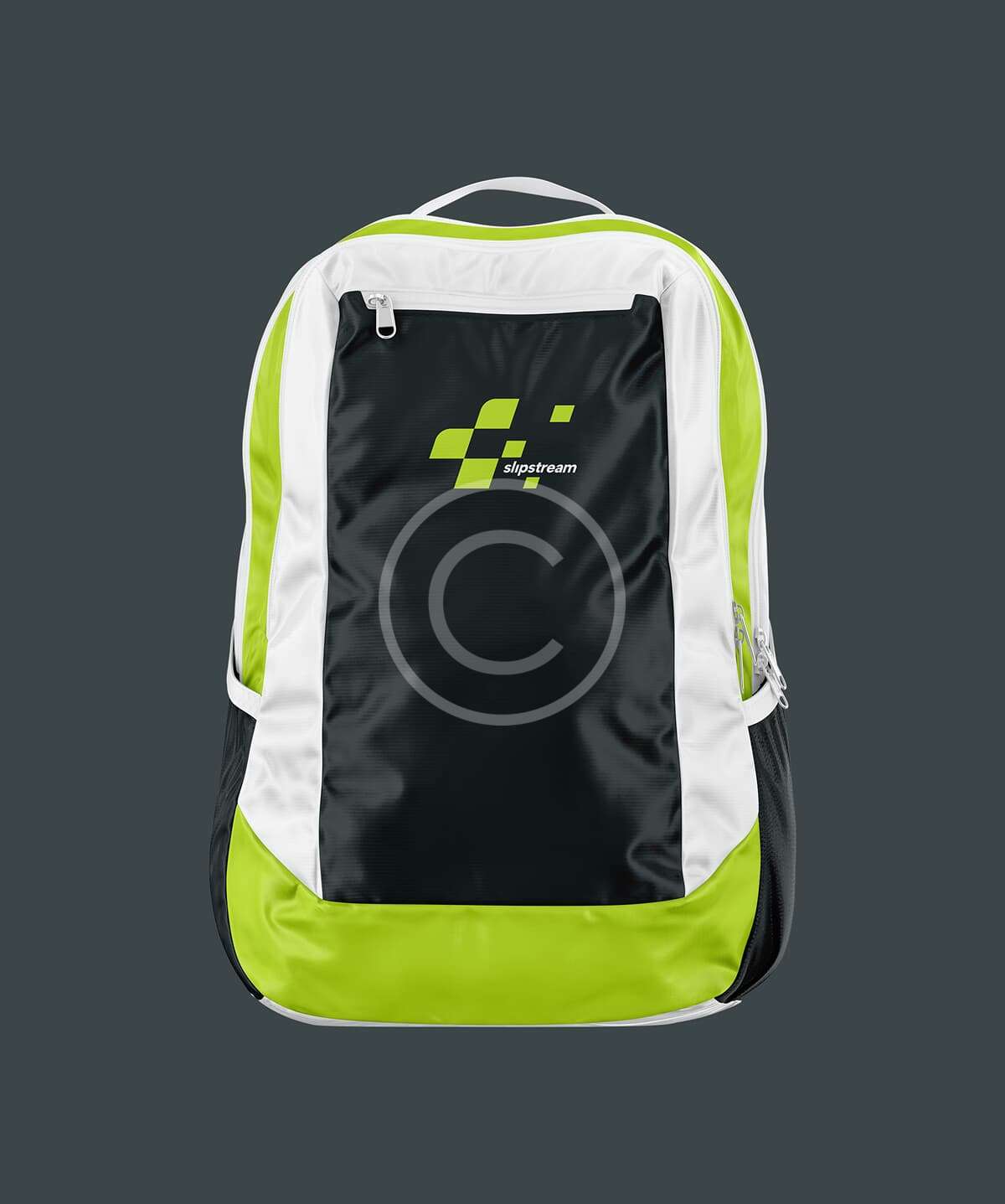 A black, white, and neon green backpack designed for fans on the go—spacious, durable, and inspired by F1 pit-lane energy.