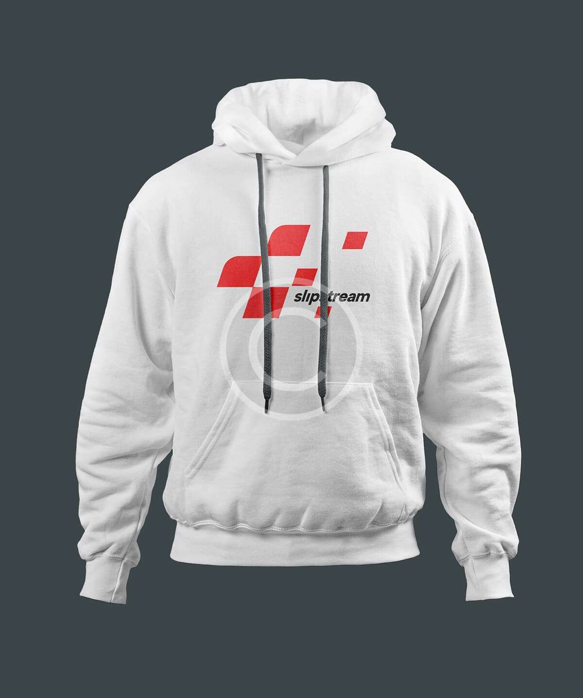This clean white sweatshirt features a bold red abstract racing design, offering comfort and a sleek motorsport-inspired aesthetic.