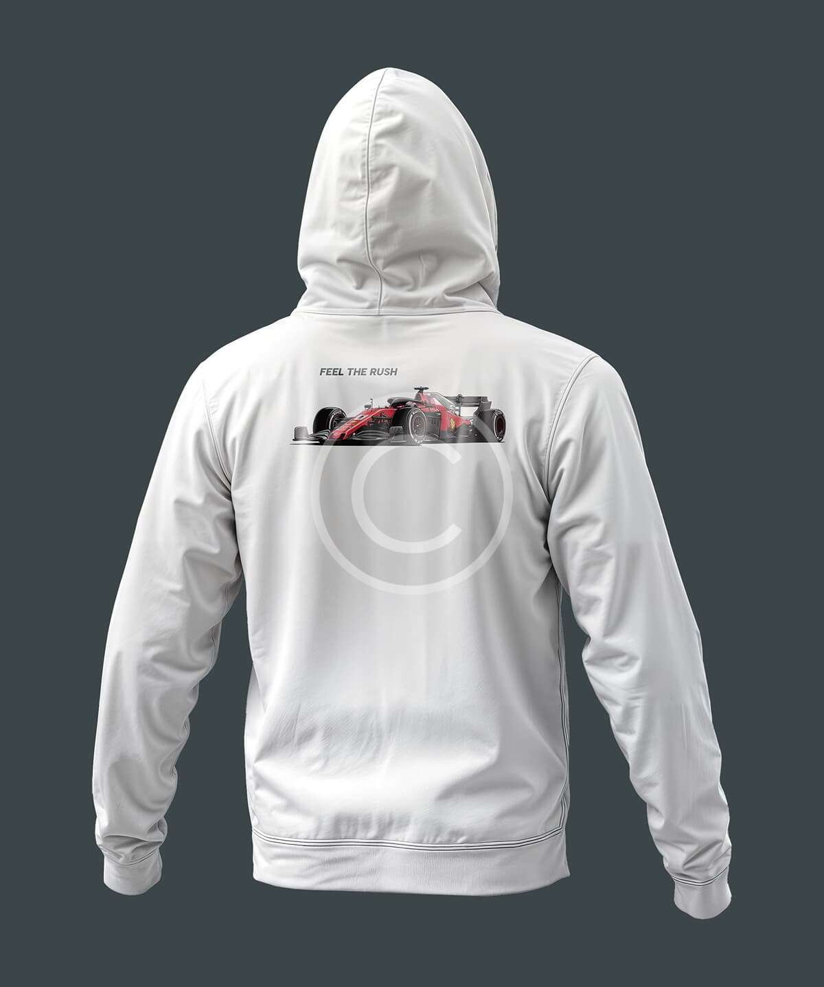 Perfect for fans and racers alike, this white sweatshirt blends comfort and style. The red performance print adds dynamic flair, while the relaxed fit and soft interior make it ideal for both the paddock and the street.